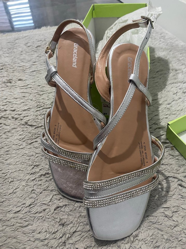 Graceland marka. Deichmandan alındı . Gri kadın sandalet, bilekten tokalı ve taş detaylıdır. Rahat tabanlı, düğün ve özel anlar için uygundur. Arkadaşımın düğününde topuklu ayakkabı rahatsız ettiğinde kullanmak için yedek almıştım 1 kez kullandım