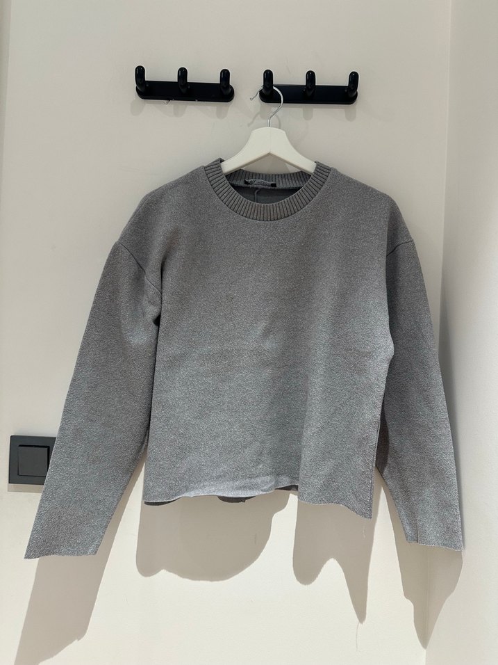 Gri bisiklet yaka, uzun kollu, salaş kesim, yumuşak ve sıcak kumaştan yapılmış günlük kullanıma uygun rahat bir kazak.