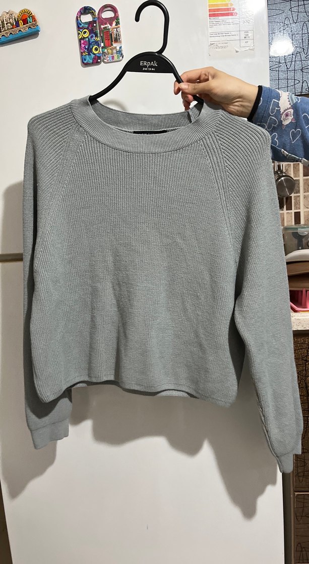 Gri-açık mavi renkli, bisiklet yaka ve uzun kollu bu triko kazak, bol kesimiyle rahat bir kullanım sunar. Günlük kullanıma uygun, konforlu ve sade bir modeldir.