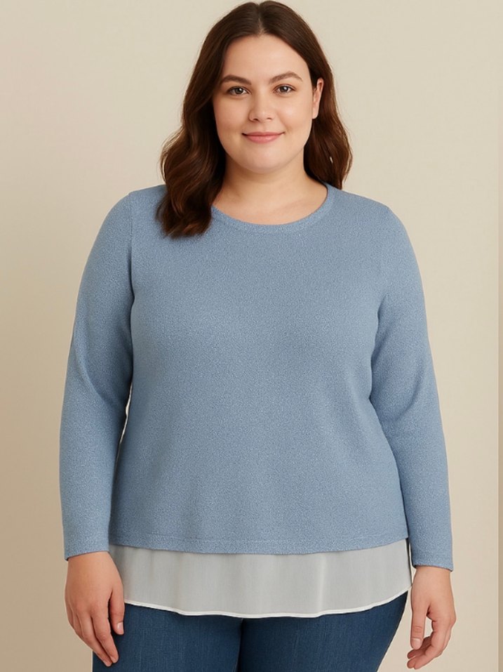 Gri, bisiklet yaka ve uzun kollu kadın triko kazak. Rahat kesimi ve midi boyuyla günlük kullanıma uygun, denim görünümlü kumaştan üretilmiştir.