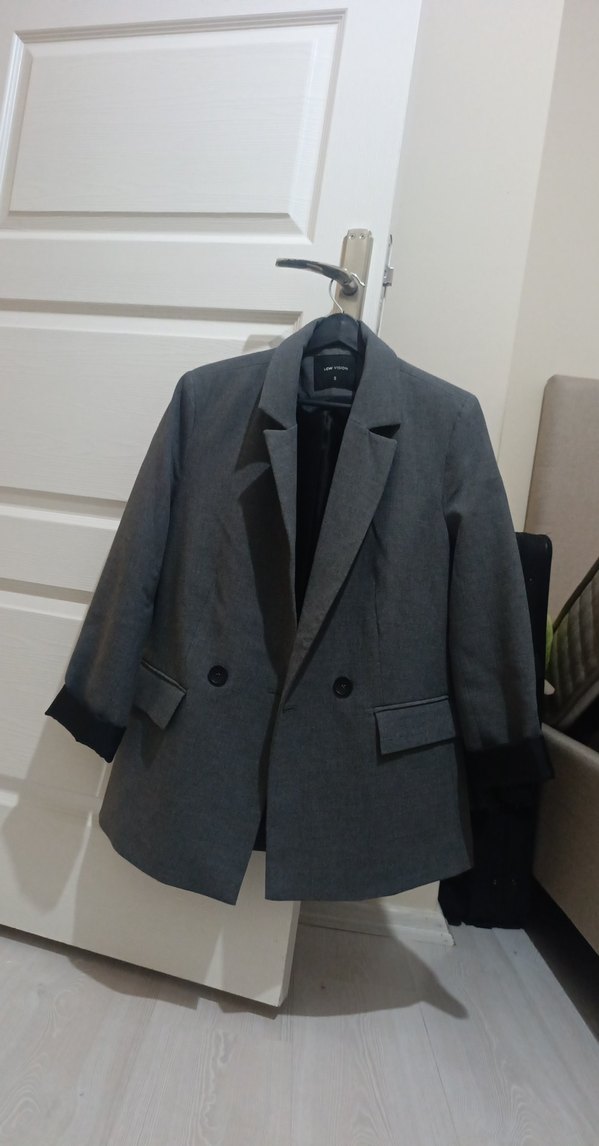 Gri renk, düğmeli, kesik yakalı kadın blazer ceket. Uzun kollu, midi boyda, normal kesim, ofis ve rahat sokak stili için uygun. Sentetik kumaştan üretilmiştir.