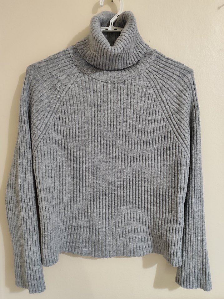 Gri renkli, boğazlı ve uzun kollu, fitilli örme dokulu kadın kazak. Rahat ve normcore tarzıyla günlük kullanıma uygun.