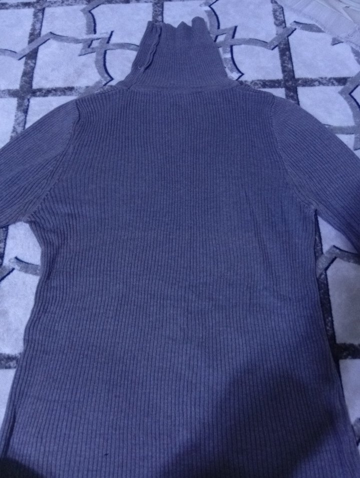 Gri renkli, ince triko örme kumaştan yapılmış, boğazlı ve uzun kollu, vücuda oturan kadın kazak. Günlük rahat sokak stili için uygundur.