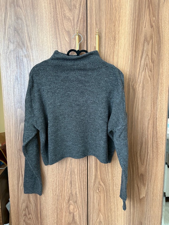 Gri renkte, yün örgü kumaştan yapılmış, boğazlı ve uzun kollu, kısa ve bol kesim kadın kazak. Rahat ve günlük sokak tarzı için uygundur.