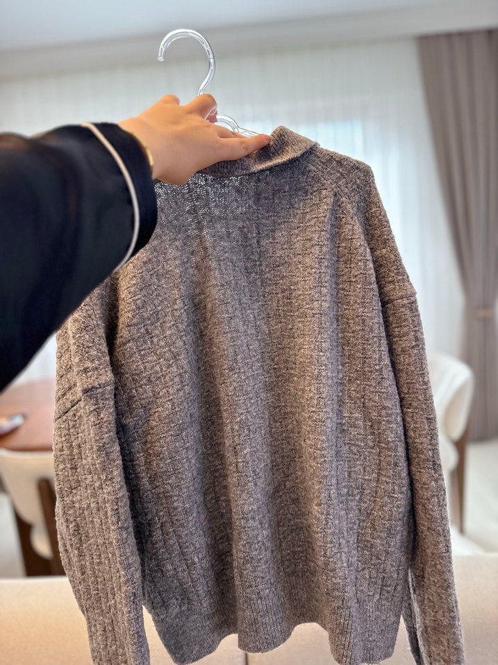 Gri renkte, boğazlı ve uzun kollu, gevşek kesim örgü kazak. Normcore tarzda, midi boyda ve desensiz, günlük kullanıma uygun rahat model.