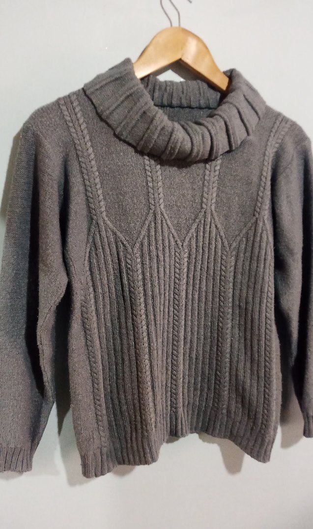 Gri örgü kazak, boğazlı ve uzun kolludur. boy 60 göğüs 50 cm M beden esnek örgü Rahat kesimi ve desensiz tasarımıyla günlük kullanıma uygundur.