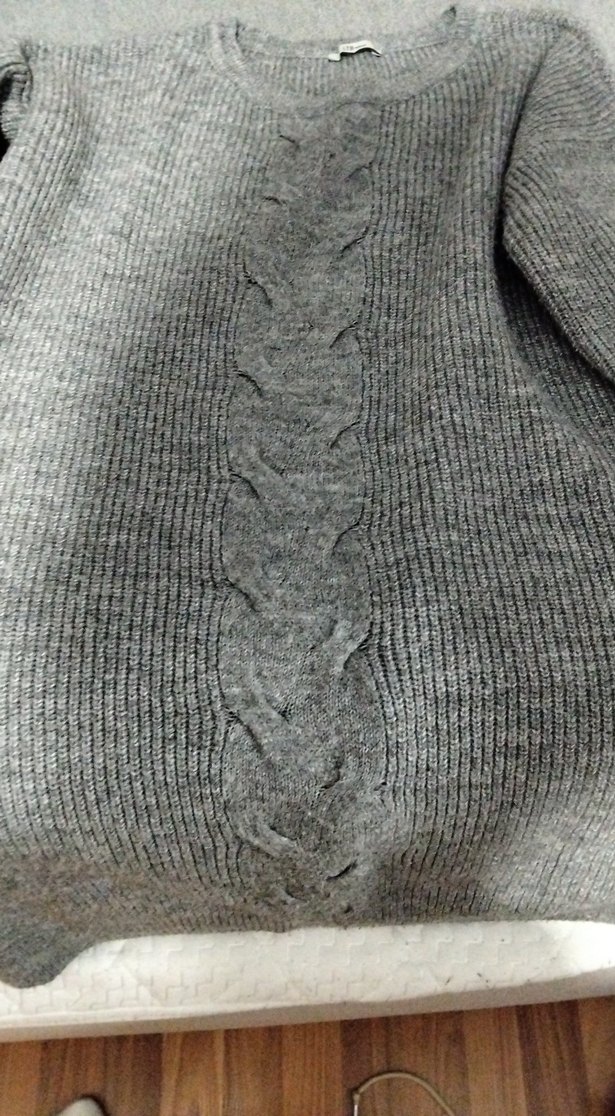 Boğazlı, uzun kollu ve vücuda oturan gri kadın kazak. Örgü yünden yapılmış, desensiz ve rahat normcore tarzındadır.