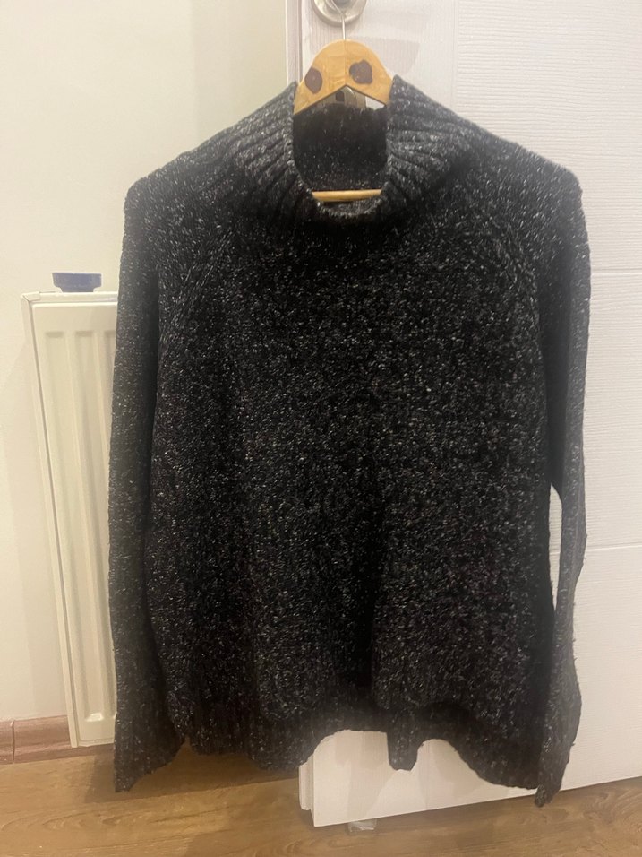 Gri renkli, örgü yünden yapılmış boğazlı ve uzun kollu, rahat ve bol kesime sahip, midi uzunlukta sade desenli kazak. Kenarında yırtmacı var arkası daha uzun önden