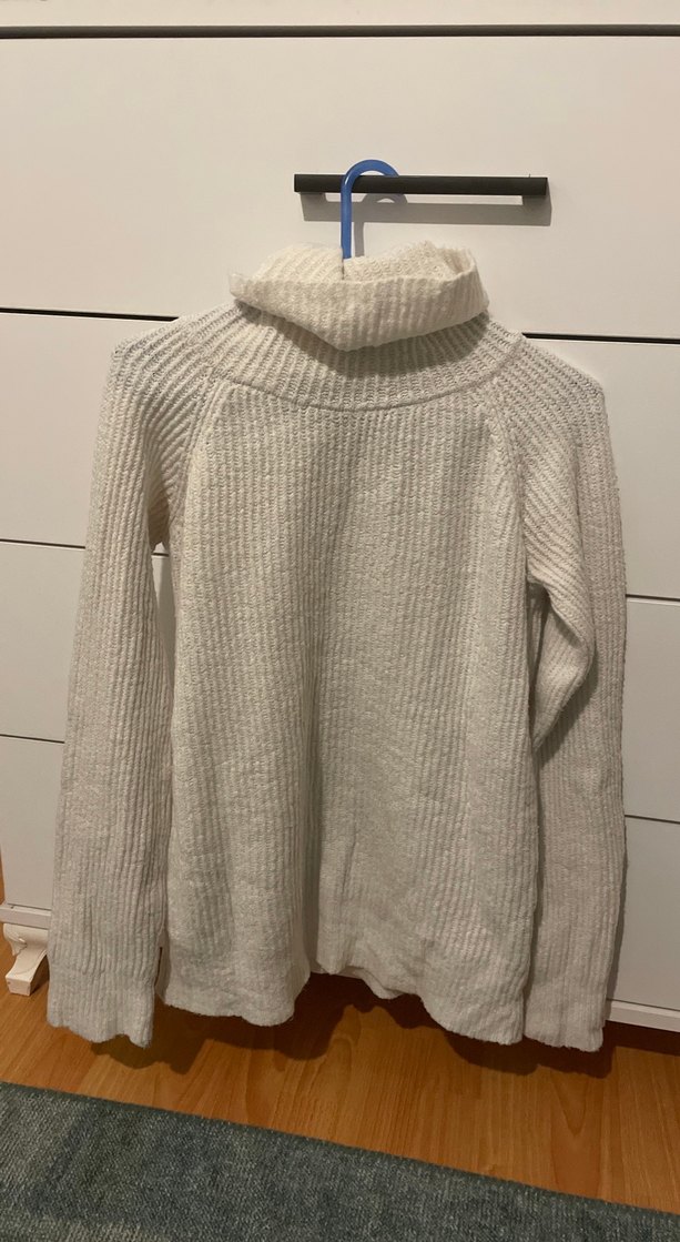 Gri renkte, boğazlı ve uzun kollu, örgü dokulu yün kazak. Rahat ve bol kesimli, normal boyda, günlük kullanıma uygun.