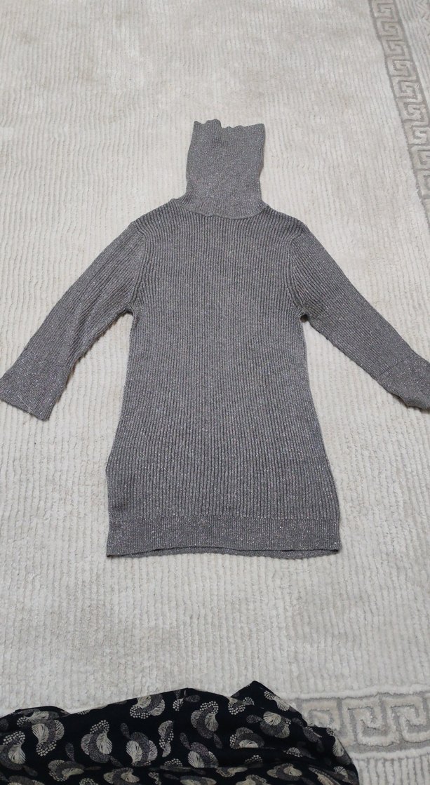 Gri renkli simli boğazlı, yarım kollu, vücuda oturan triko kadın kazak, rahat ve günlük kullanım için uygundur. Koltuk altından alt lastiğe 35 cdir omuzdan kol boyu 34 cmdir