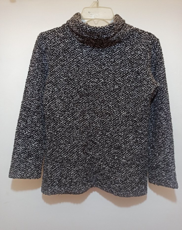 İki koltuk altı arası 42cm. Omuzdan boy 54cm. Bu gri boğazlı triko kazak, uzun kollu ve vücuda oturan kesime sahiptir. Yumuşak sentetik kumaştan örülmüştür, rahat ve günlük kullanıma uygundur.