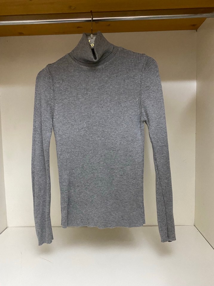 Gri renkte, boğazlı ve uzun kollu, yumuşak keten kumaştan örülmüş, vücuda oturan kadın triko kazak. Günlük sokak stili için uygundur. M için uygundur