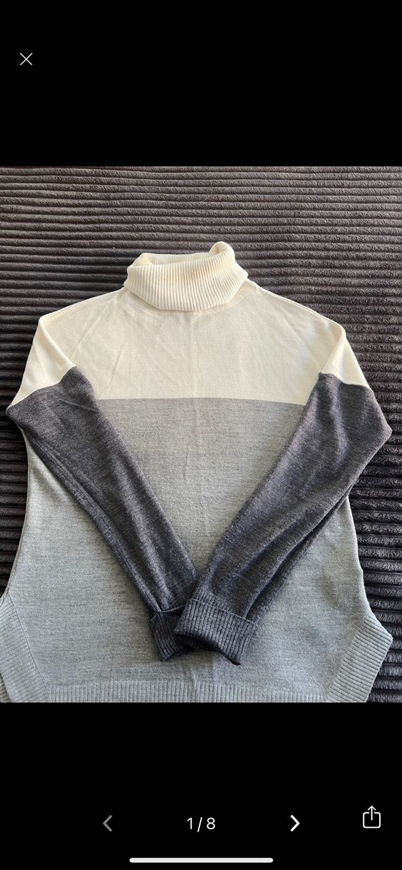 Bu kadın kazak, boğazlı ve uzun kollu, fitted kesime sahiptir. Yumuşak yün kumaştan, örgü dokusuyla gri renk bloklu tasarıma sahiptir. Günlük kullanıma uygun rahat ve şık bir modeldir.