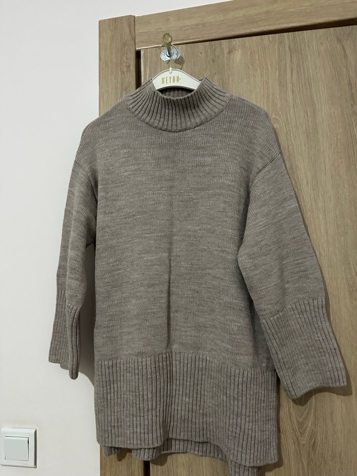 Bu kadın kazak, boğazlı ve uzun kollu örgü yapıya sahip. Gri yün kumaştan, rahat ve salaş kesimle günlük kullanıma uygun. S beden