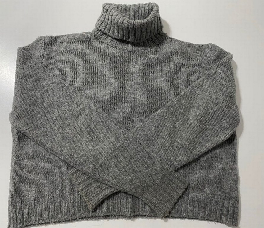 Bu gri yün kazak, boğazlı ve uzun kollu olup, örme dokusu ve sade tasarımıyla günlük kullanıma uygundur.