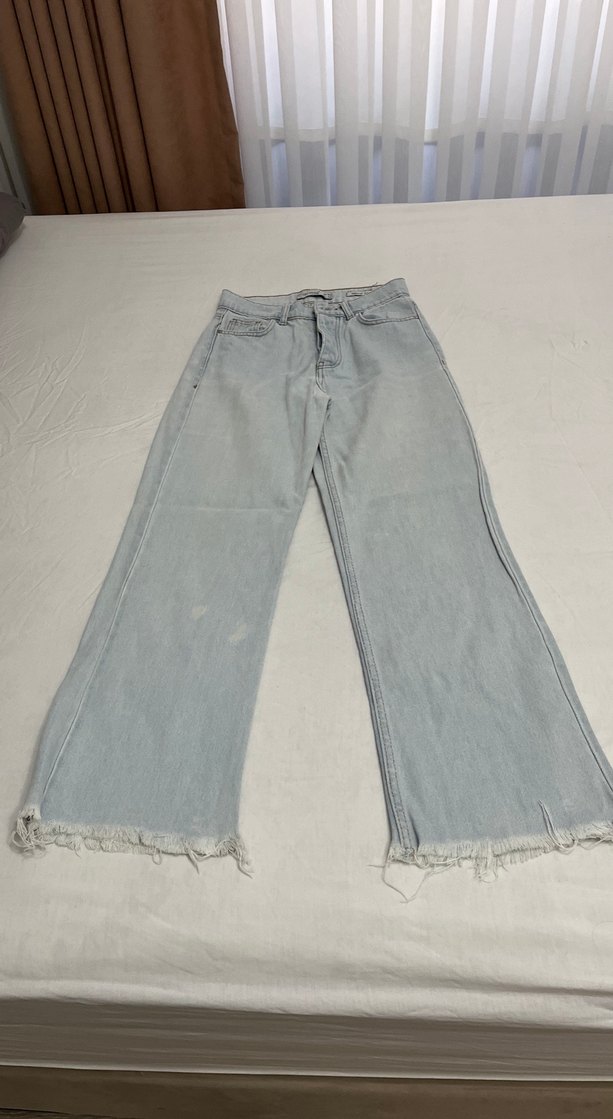 Gri bol kesim denim pantolon, ve püsküllü kenarlarla günlük sokak stili için rahat ve şık bir seçim.