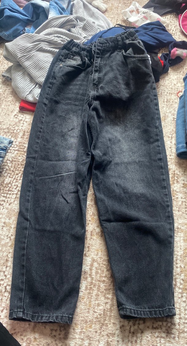 Gri renkte, bel kemerli, bol kesim kadın denim pantolon, normal midi boyda, günlük rahat kullanım için uygundur.