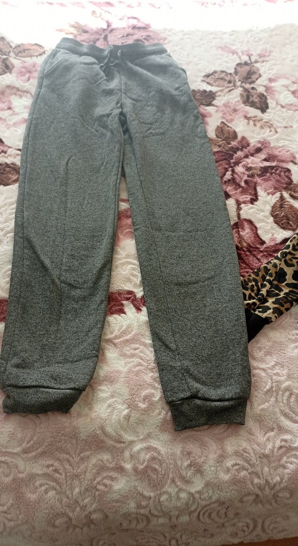 Gri renkli, bol kesim ve kemerli kadın eşofman altı. Yumuşak sentetik kumaştan, uzun boylu ve sade desensiz tasarım, günlük rahat kullanıma uygun.