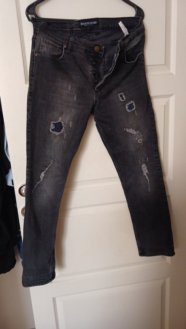Bol kesim, gri denim kot pantolon, midi boyda ve tokalı detaylı. Yıpranmış görünümlü, sokak tarzına uygun günlük kullanım için ideal.