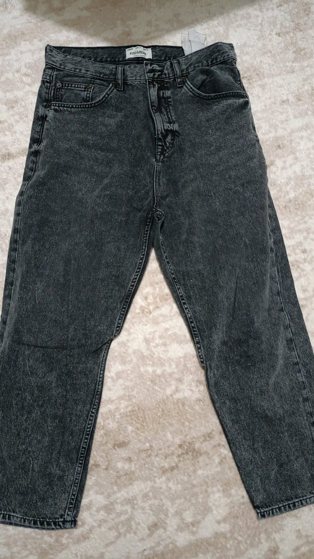 Gri renkte, bol kesim ve midi boy kot pantolon, kürk detaylı ve rahat sokak tarzı. Günlük kullanım için uygundur.