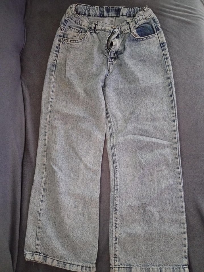 Gri denim kumaştan, bol kesim ve midi boyda, kemerli kadın kot pantolon, günlük sokak stili için uygundur.