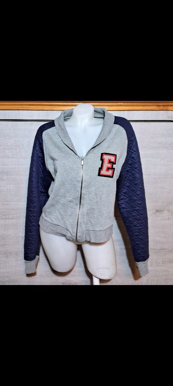 Nakışlı 'E' harfi detaylı, fermuarlı, uzun kollu, kışlık, gri lacivert kadın ceket. Bel 49 cm Boy 52 cm
