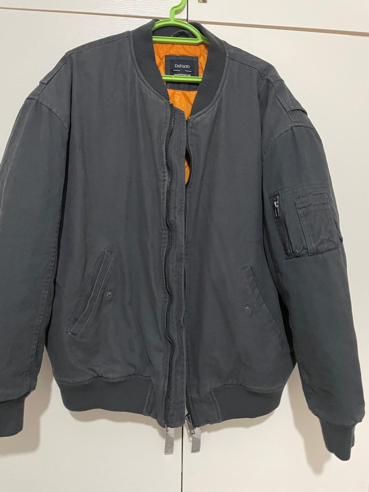 Gri renkli, bol kesim kadın bomber ceket, fermuarlı ve uzun kolludur. Yuvarlak yaka ve midi boyda, suni kumaştan üretilmiştir, sokak stili için uygundur.