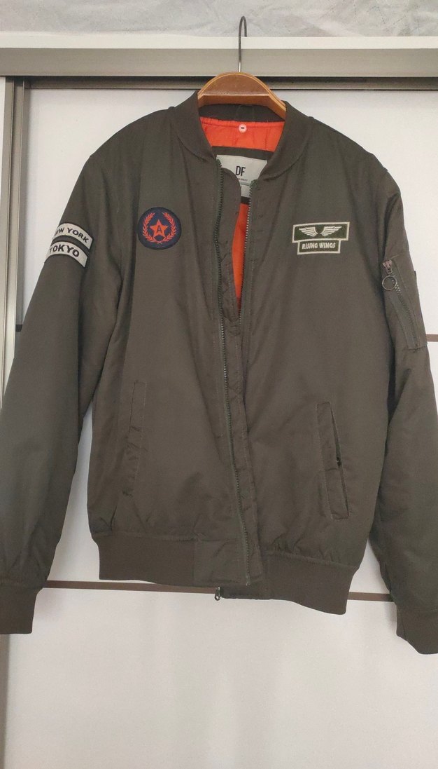 Gri bomber ceket, regular fit, uzun kollu ve yuvarlak yaka. Baskılı patchler ve fermuarlı detaylar içerir, sentetik kumaştan yapılmıştır.