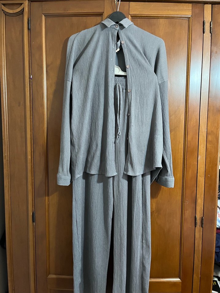 Gri bürümcük kumaştan, uzun kollu, pileli detaylı, bol kesim kadın takımı. Çok az kullanıldı çok rahat ve çok sportif