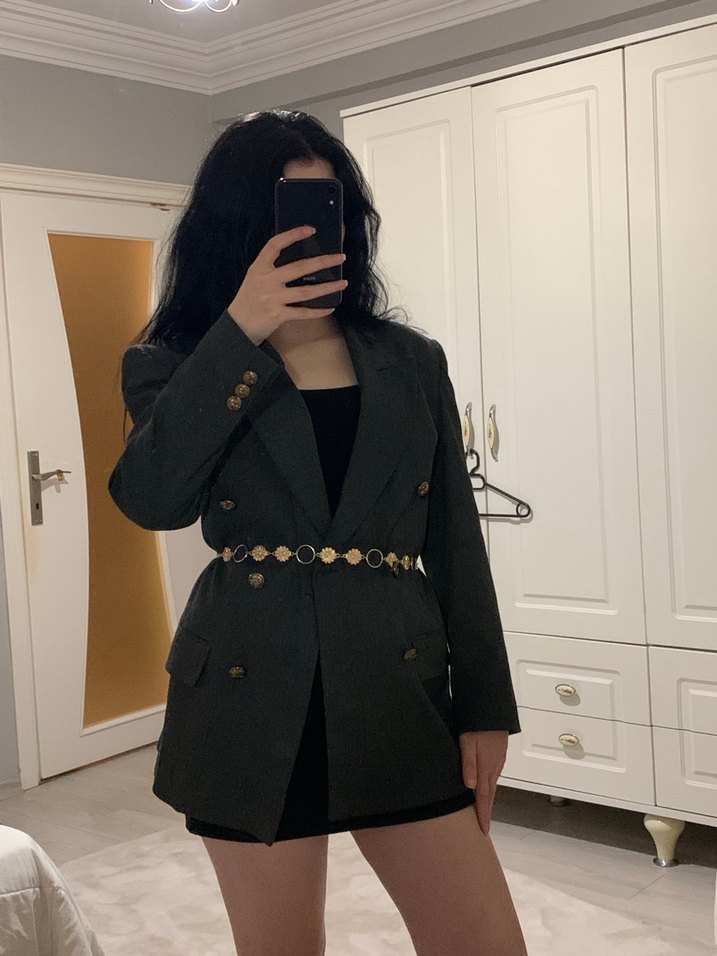 Gri ceket, oturmalı kesim, yakalı ve tokalı. Ofis için uygun, uzun kollu. Kemer hariç sadece ceket satışta bilginiz olsun Zara değil.
