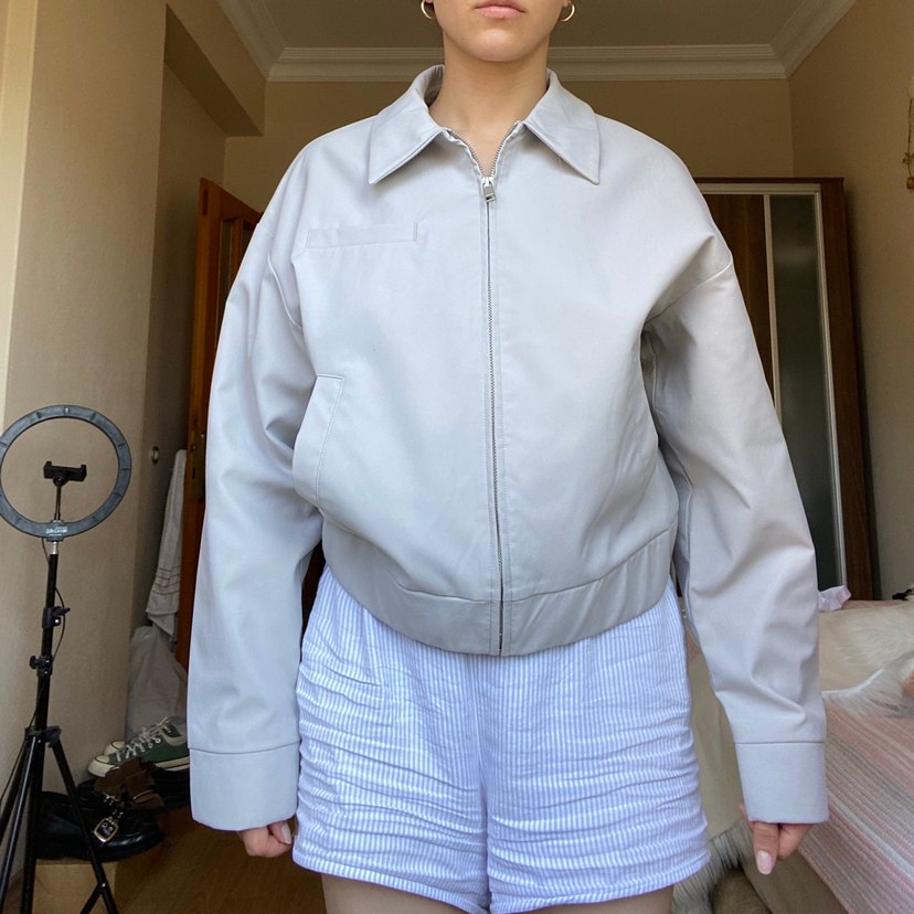 Gri kadın ceket, uzun kollu ve fermuarlı detaylıdır. Normal kesim ve günlük kullanıma uygun rahat bir modeldir.