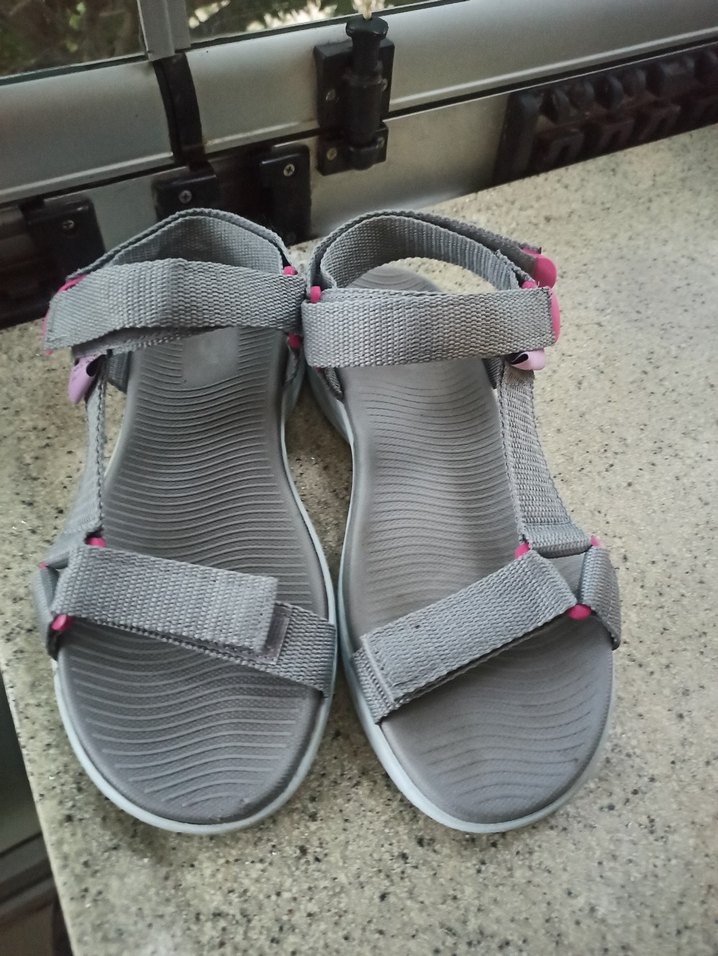 Gri renkte, cırt cırtlı bantlara ve dolgu topuğa sahip kadın sandalet. 40 numara için uygundur hiçbir sorun yok 2 defa giydim