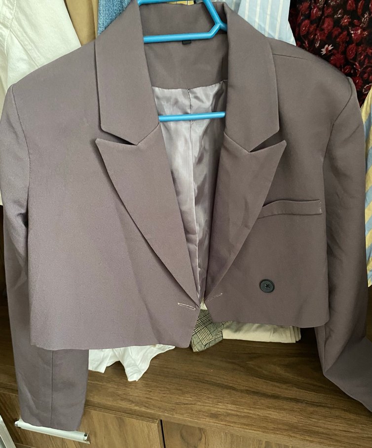 Gri renkli, düğmeli kadın blazer ceket. Crop kesim ve uzun kolludur.Ofis ve günlük kullanıma uygun, düz desensiz ve şık bir cekettir.40 beden lakin m giyenlere de olacaktır. Hiç giyemedim