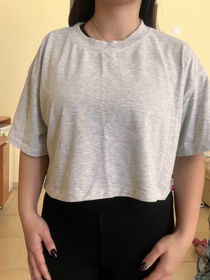 Gri crop tişört, yuvarlak yaka ve kısa kollu, salaş kesimlidir. Yumuşak sentetik kumaştan üretilmiş olup, günlük rahat ve şık bir görünüm sunar. Sokak stili için uygundur.
