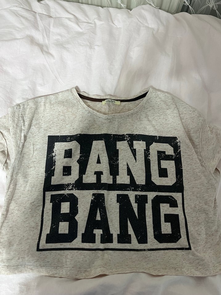 Gri renkli, pamuk kumaştan kadın crop top, uzun kollu ve salaş kesimdir. Üzerinde "BANG BANG" baskısı bulunan bu parça, rock punk tarzına uygun sokak modası için idealdir.