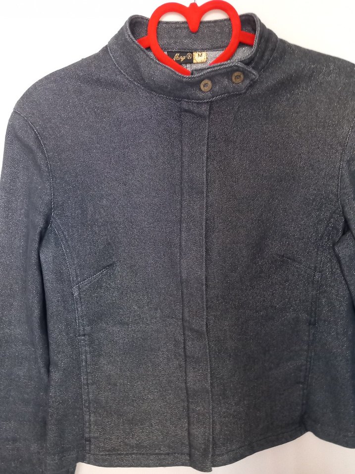 Gri renkte, düğmeli ve kruvaze yaka detaylı kadın denim biker ceket. Uzun kollu ve normal kesim, günlük kullanıma uygun.