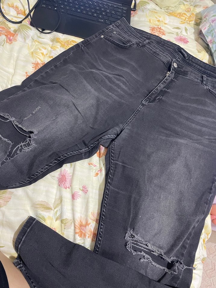 Gri renkli, bol kesim ve normal boyda, yırtık detaylı ve tokalı kadın denim jean, günlük sokak tarzı için uygundur.