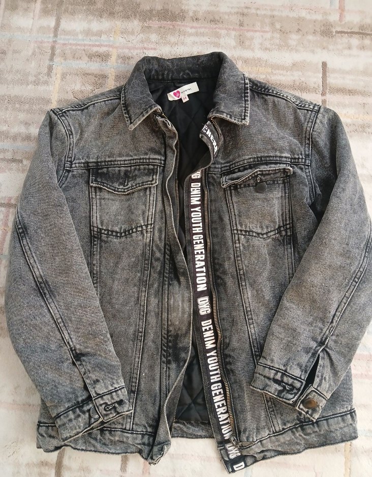 Gri renk, normal boy midi uzunlukta, fermuarlı ve notched yaka detaylı kadın denim ceket. tertemiz yırtılma sökülme leke yok biraz giyildi bana dar geldiği için satıyorum