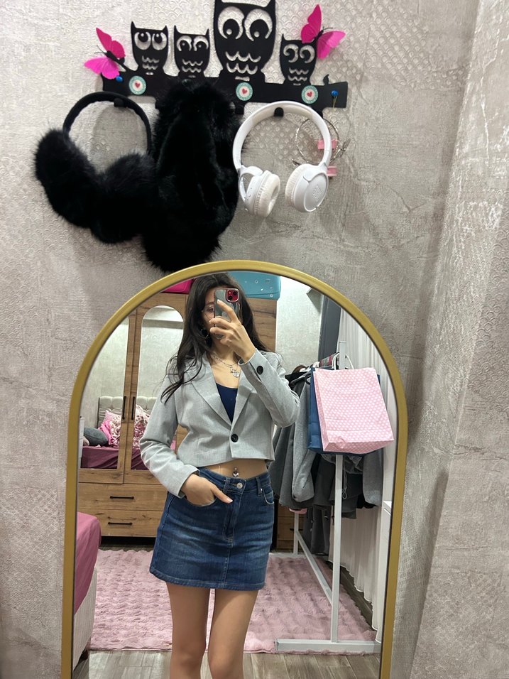 Gri Kadın Denim Ceket - Bağlama Desenli kısa blazer ceket