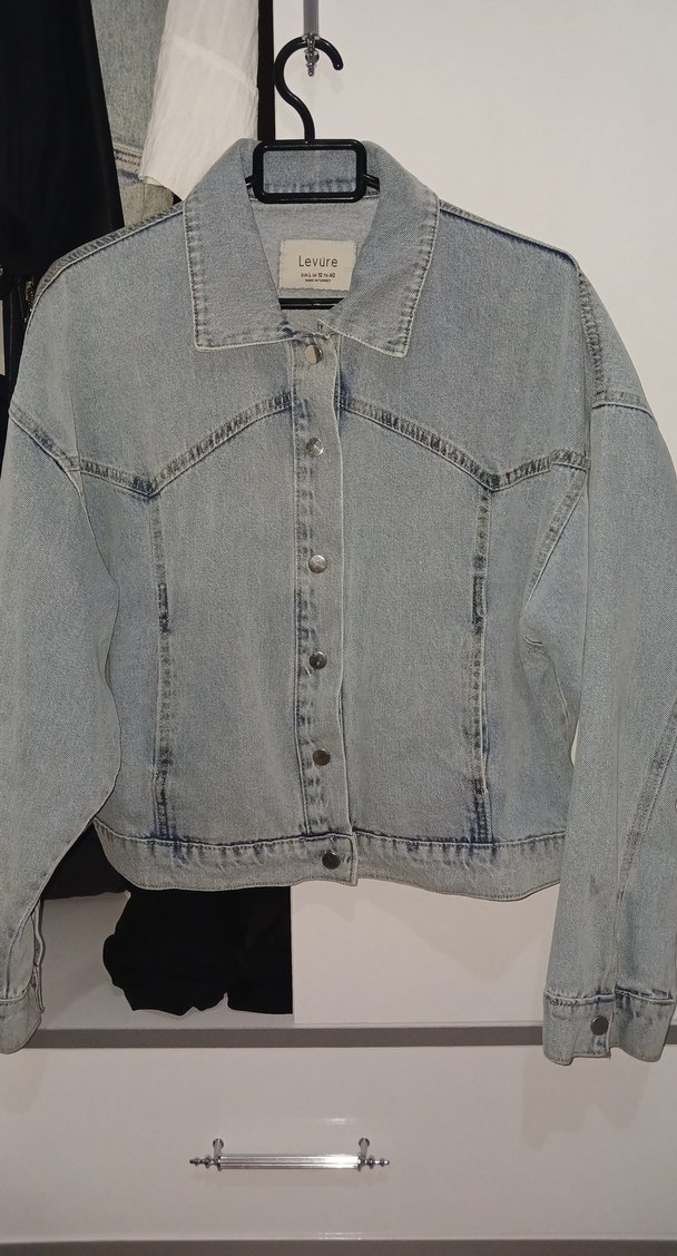 denim ceket, uzun kollu ve düğmeli. Notlu yakalı, midi boyda, günlük ve sokak stiline uygun.