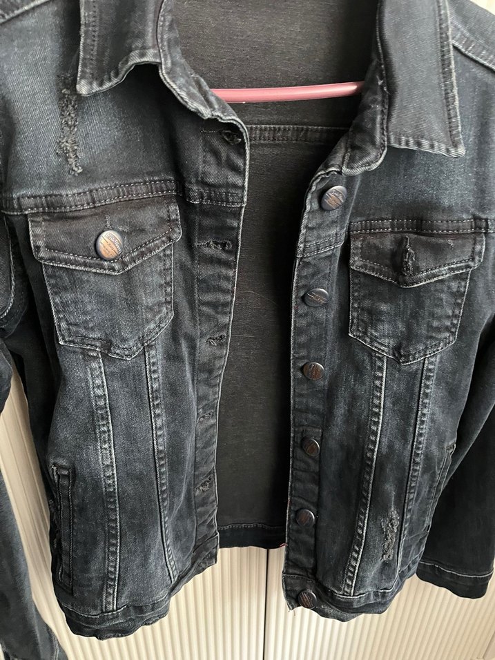 Gri renkli, düğmeli, uzun kollu ve kesimli kadın denim ceket. İki göğüs cebine sahip, günlük ve sokak stiline uygun bir parça. Sorunsuz