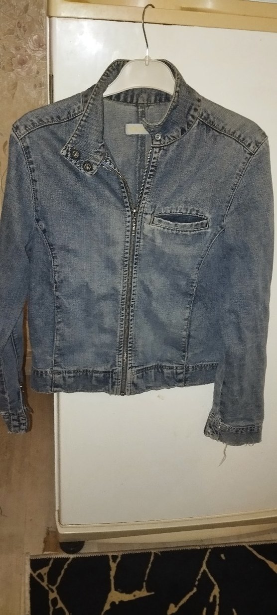 Düğmeli, ince kesim gri denim ceket, çentikli yaka ve uzun kolludur. Günlük rahat kullanıma uygundur. en 44 cm s bedene uygun bel 42 cm bılek kısmı yırtık model