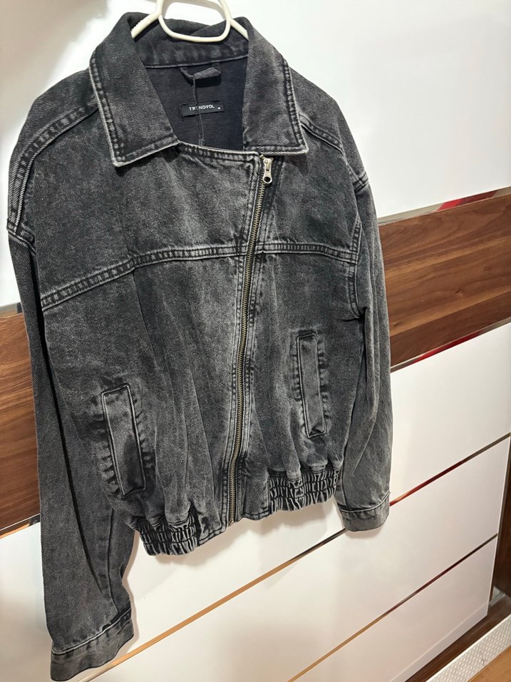 Gri renkte, fermuarlı ve notlu yaka detaylı bol kesim denim ceket. Askılı kollu ve midi uzunlukta, günlük kullanıma uygun.