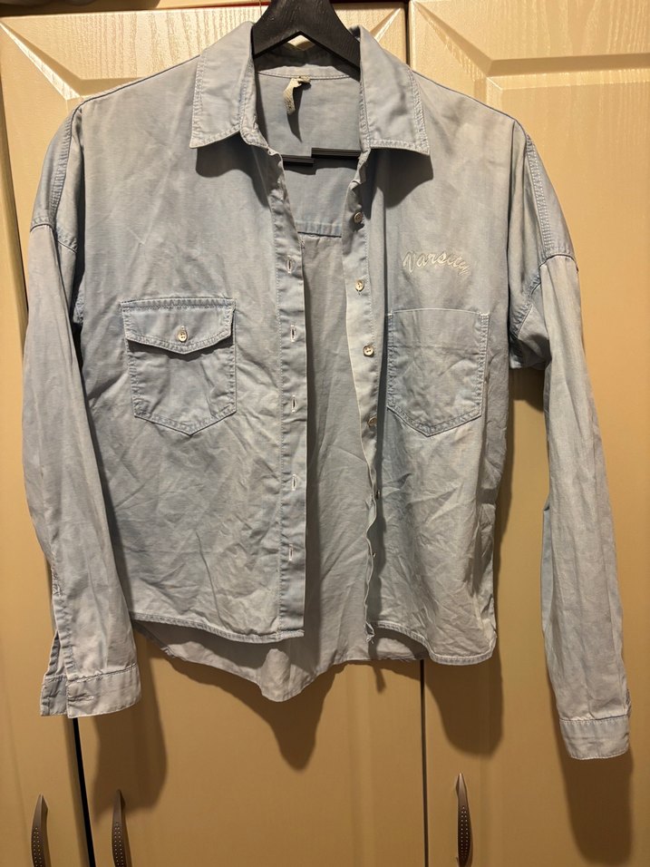 Gri renkli denim kumaştan, düğmeli ve uzun kollu, cep detaylı, salaş kesim kadın gömlek. Sokak stili için uygundur.