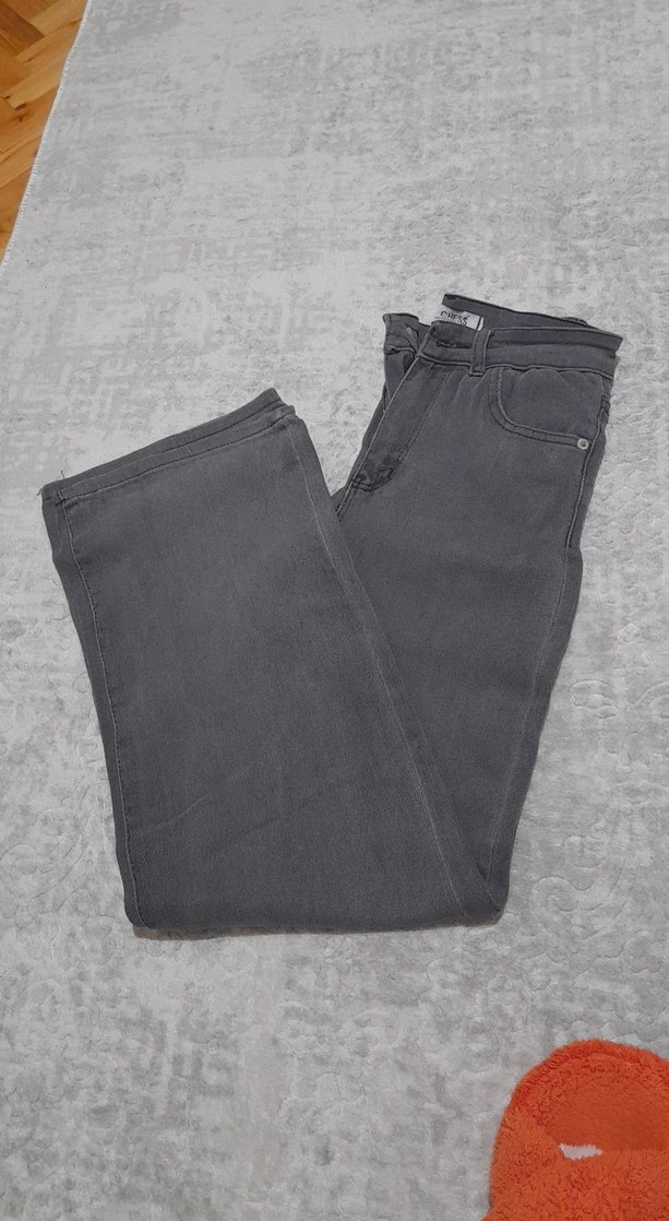 Gri renkli denim kumaştan yapılmış, normal boy ve rahat kesim kadın jean pantolon, günlük kullanıma uygun sade ve şık bir modeldir.