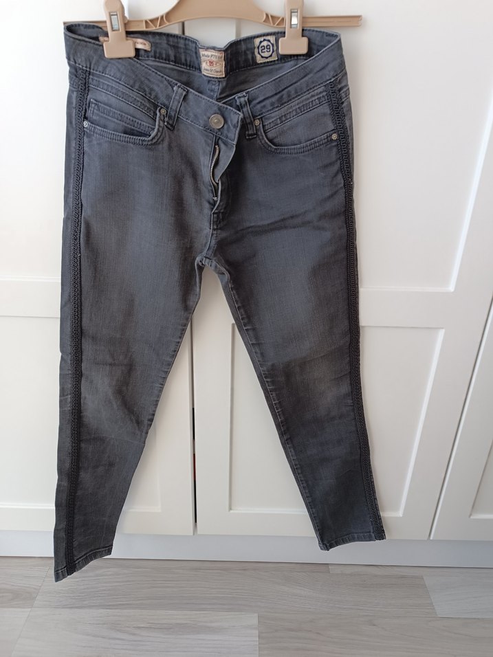 Gri denim kumaştan, kemerli ve normal midi boyda, dar kesim kadın jean. Sokak stiline uygun rahat bir tasarım.