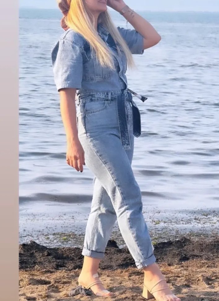 Gri denim kumaştan, kısa kollu ve kemerli, salaş kesim tulum. Notched lapel yakalı ve batik desenli, midi boyda, sokak stiline uygun şık bir parça.