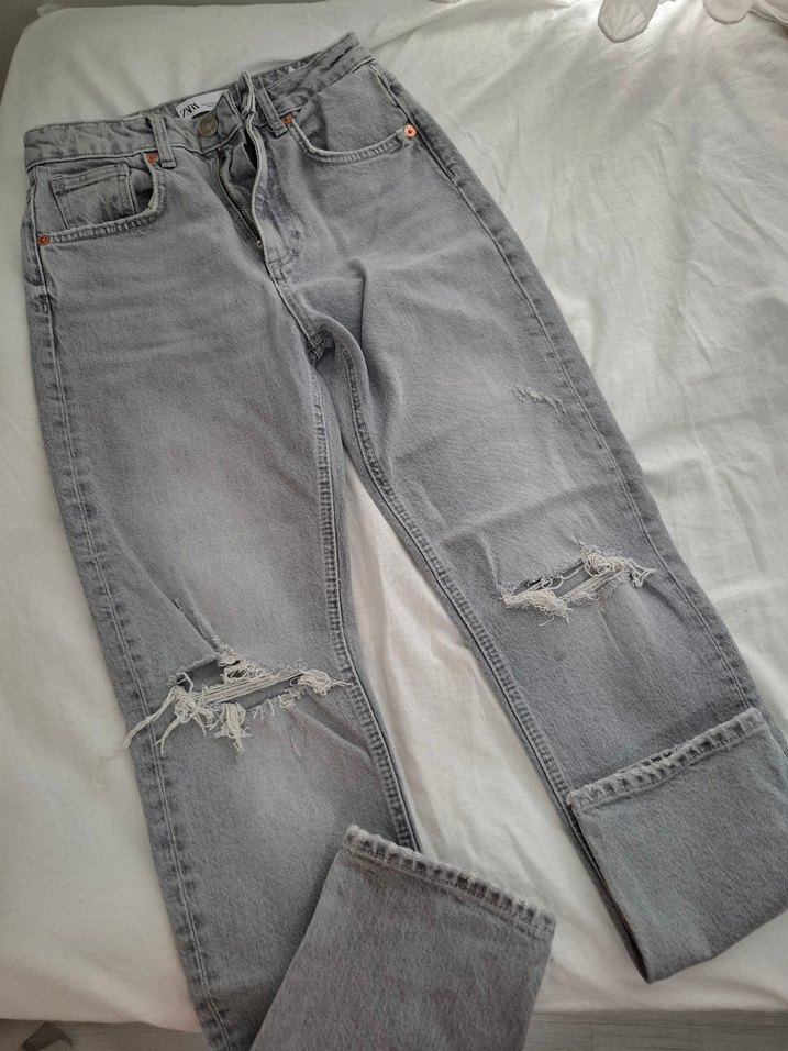 Gri denim kumaştan, regular fit pantolon. yırtık efektli, günlük sokak stili için uygun.