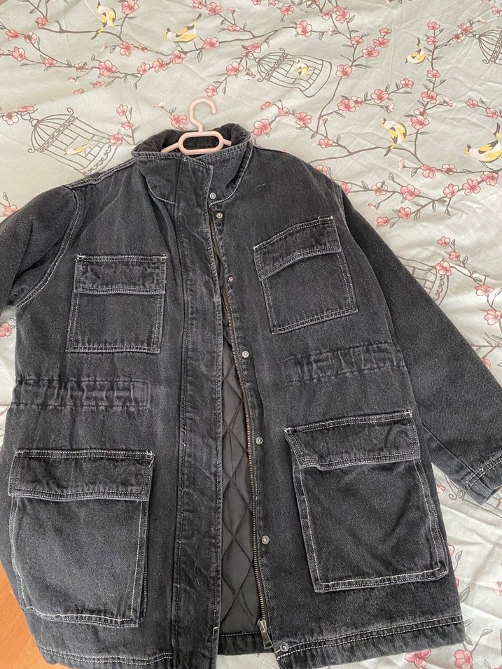 Gri renkli, bol kesim, uzun kollu ve yakalı denim midi ceket. Düğmeli ve çok cepli, günlük ve sokak stiline uygun. 1 defa giydim çok sıcak tutuyor.