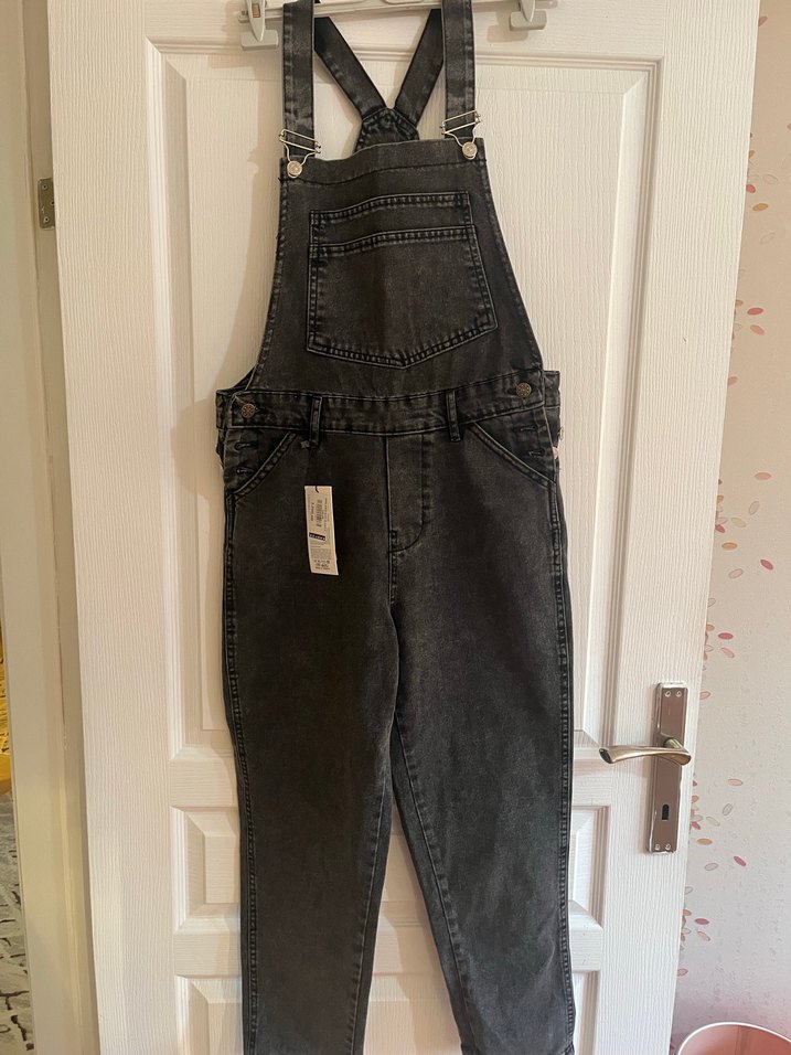 Gri denim midi tulum, bol kesim ve tokalı askılarla. Sokak tarzı için uygun, önü cep detaylı, günlük kullanıma uygun